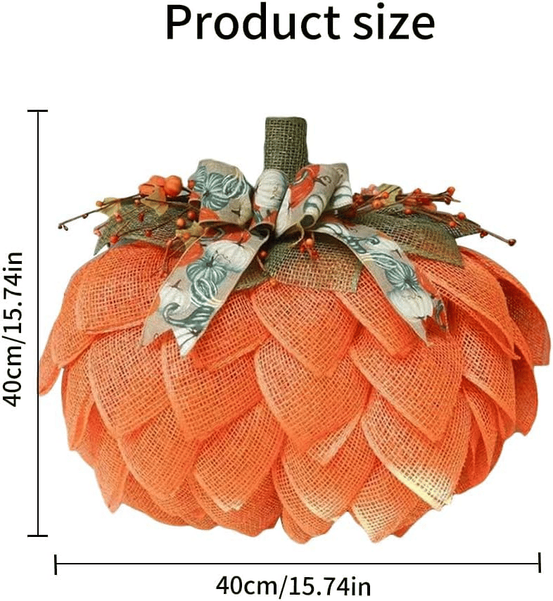 The body of the pumpkin is constructed with poly burlap mesh in orange. The pumpkin stem is olive green poly burlap mesh. Berry accents and a lovely bow adorned with pumpkins complete the look.